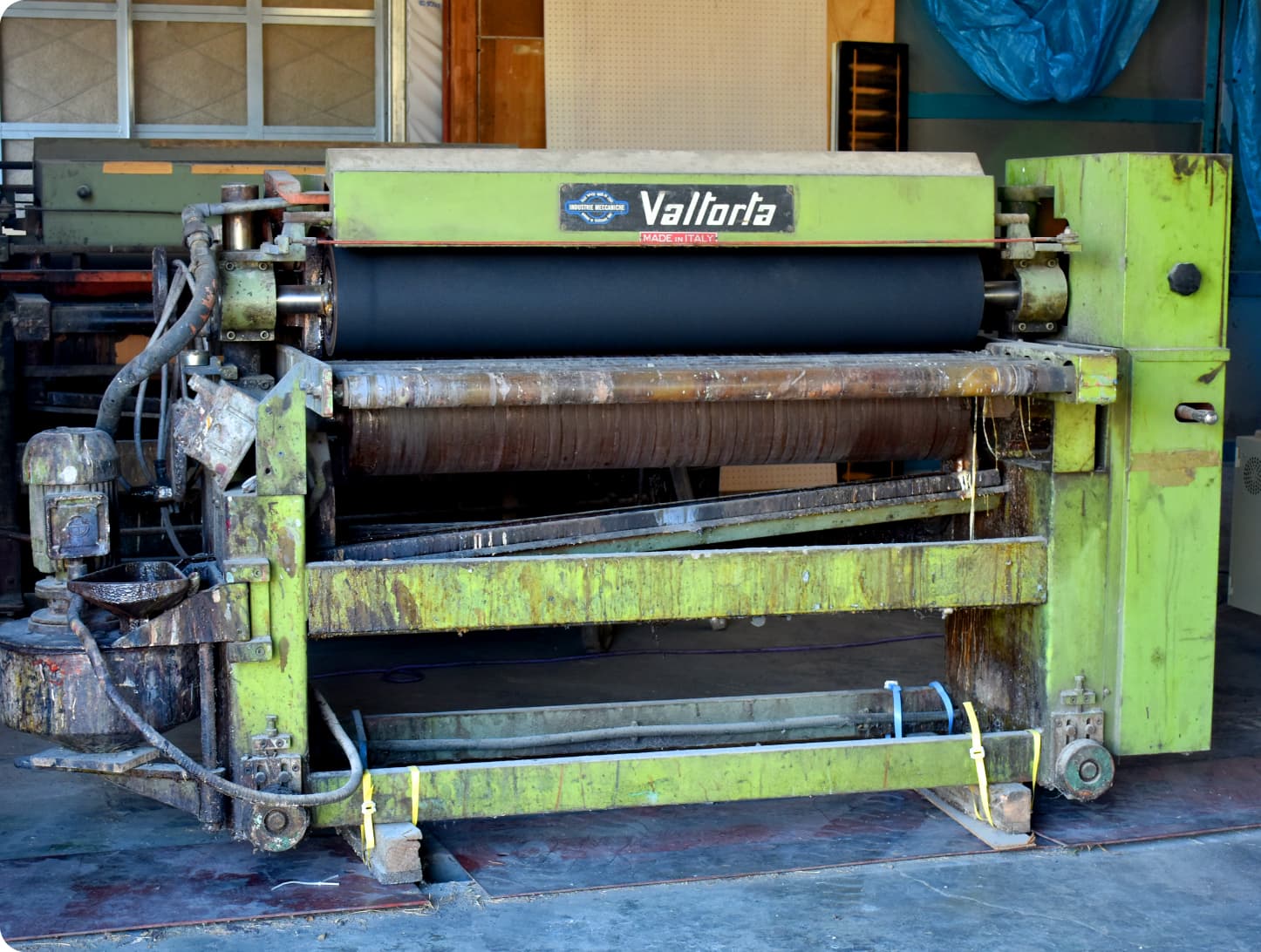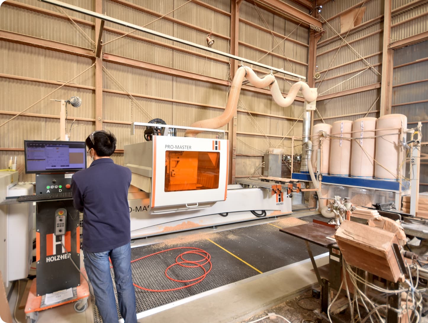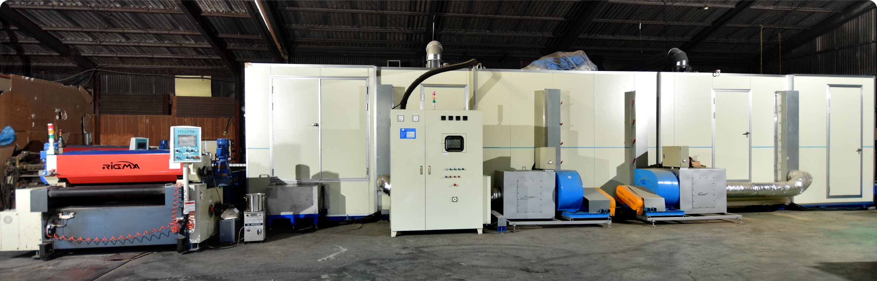 平面への塗装は、粘度コントローラーの導入により、常に最適な粘度で塗布が可能。また、最大101枚を格納でき、ロールコーターから自動で投入できる乾燥設備により、高品質な製品を一貫生産できる。
