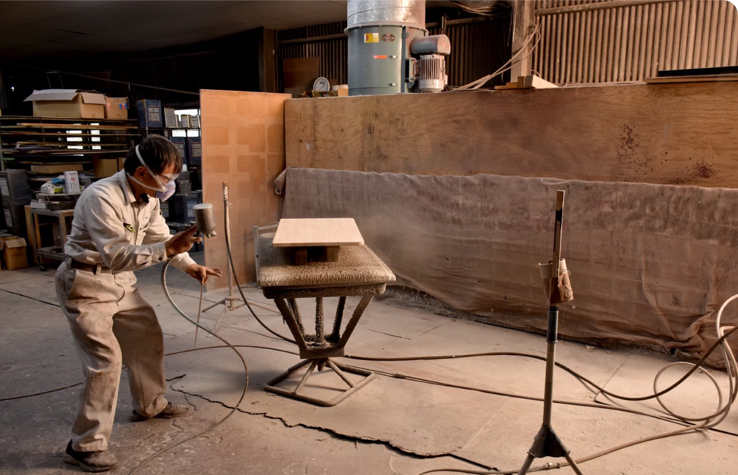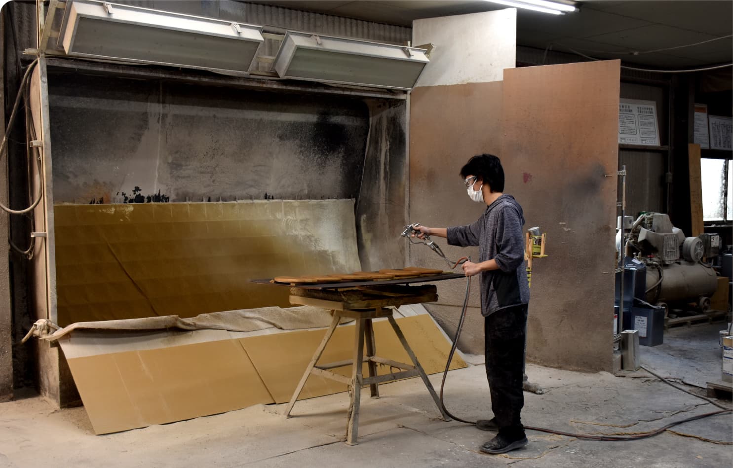 塗装ブースが2か所あり、常時4名の塗装技術者が塗布作業を行っており、